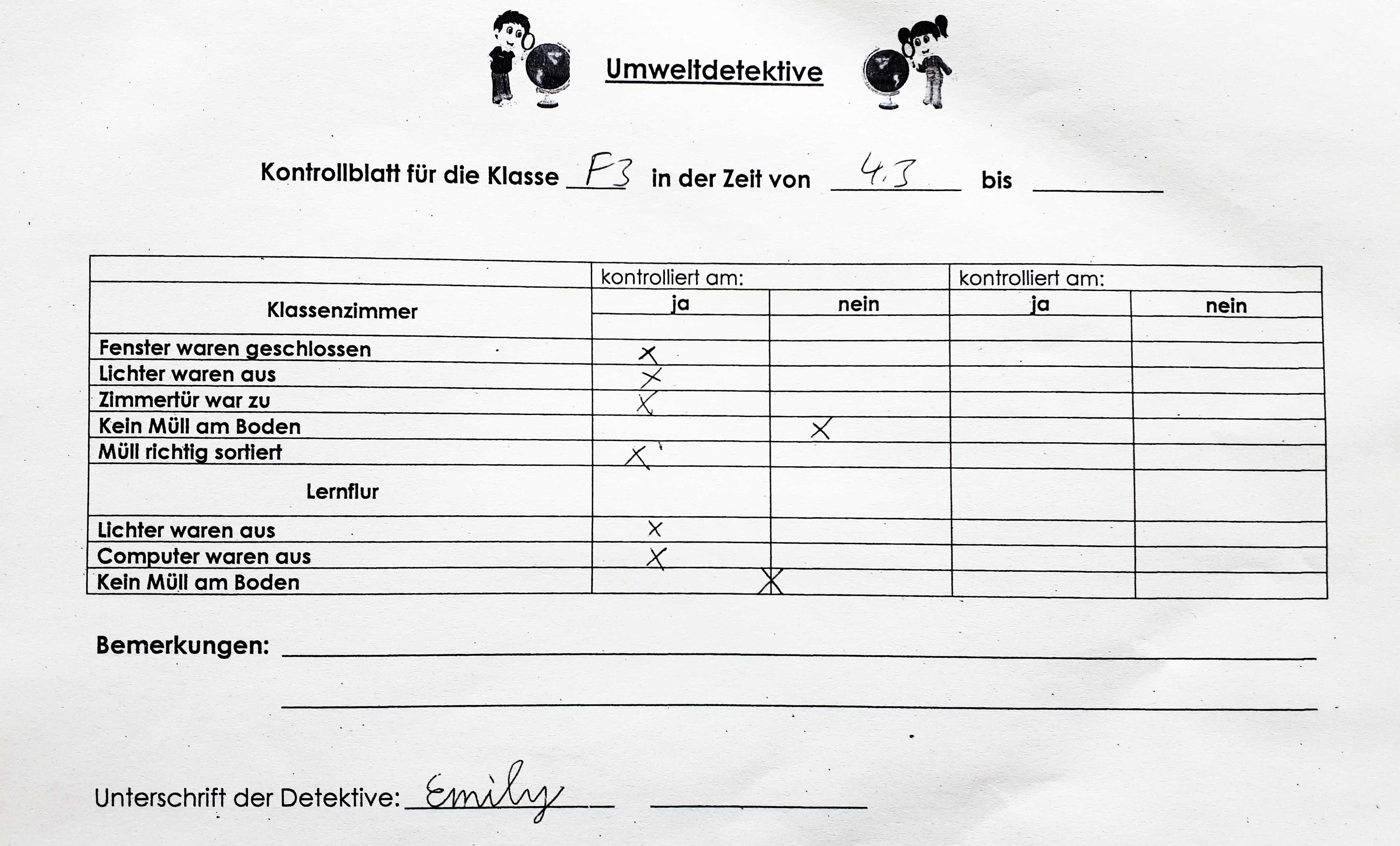 Im Klassenrat werden zwei Kinder gewählt, die für den Energie- und Mülldienst ihrer Klasse zuständig sind. Zusätzlich kontrollieren drei geschulte Umweltdetektive aus einer 4. Klasse alle Klassenzimmer in regelmäßigen Abständen. Ein Kontrollblatt dient der Rückmeldung, sodass die Klassenlehrer/innen die Ergebnisse mit den Kindern besprechen und Verbesserungsvorschläge diskutieren können. In der Schulversammlung am Ende des Schuljahres erhalten erfolgreiche Klassen als Belohnung eine Energiespar-Urkunde.